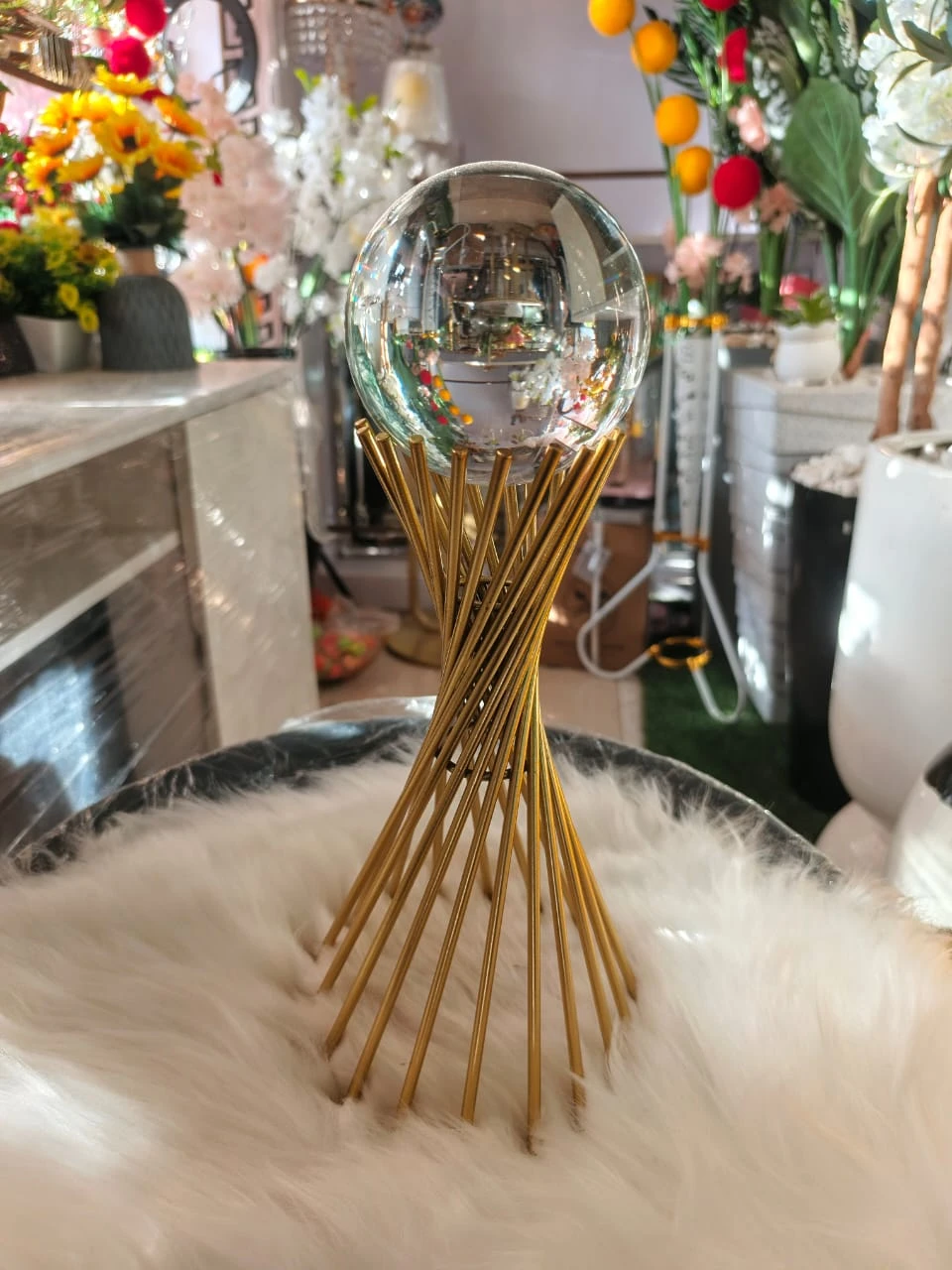The glass orb beautifully reflects surrounding light, creating a glowing and captivating decorative effect.